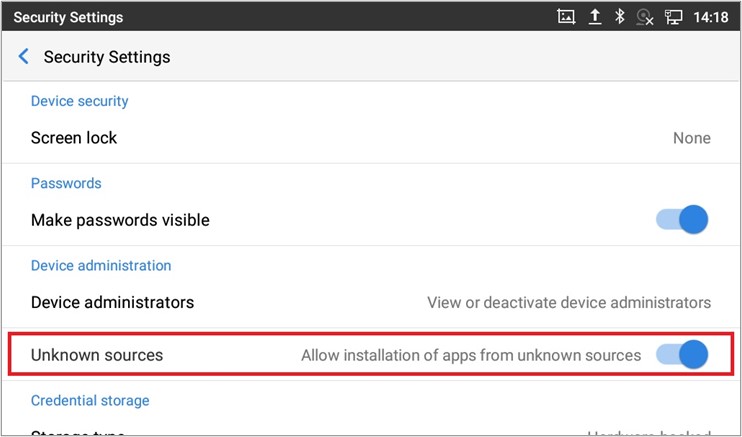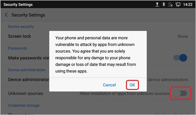 In the Security Settings screen, make sure Allow installation of apps from unknown sources is enabled (blue slider). The default is disabled (grey slider). When you enable this setting, you will see a confirmation prompt: