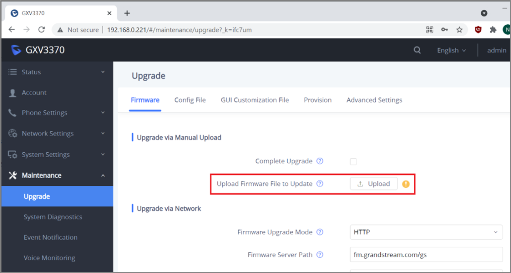From the sidebar, navigate to Maintenance, Upgrade. Download the latest firmware file from https://firmware.grandstream.com/Release_GXV3370_1.0.3.27.zip