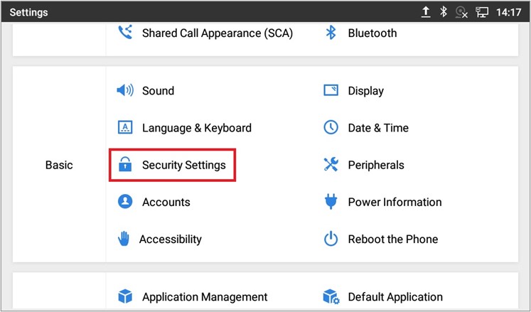 On the device, navigate to Settings, and tap Security Settings in the Basic category